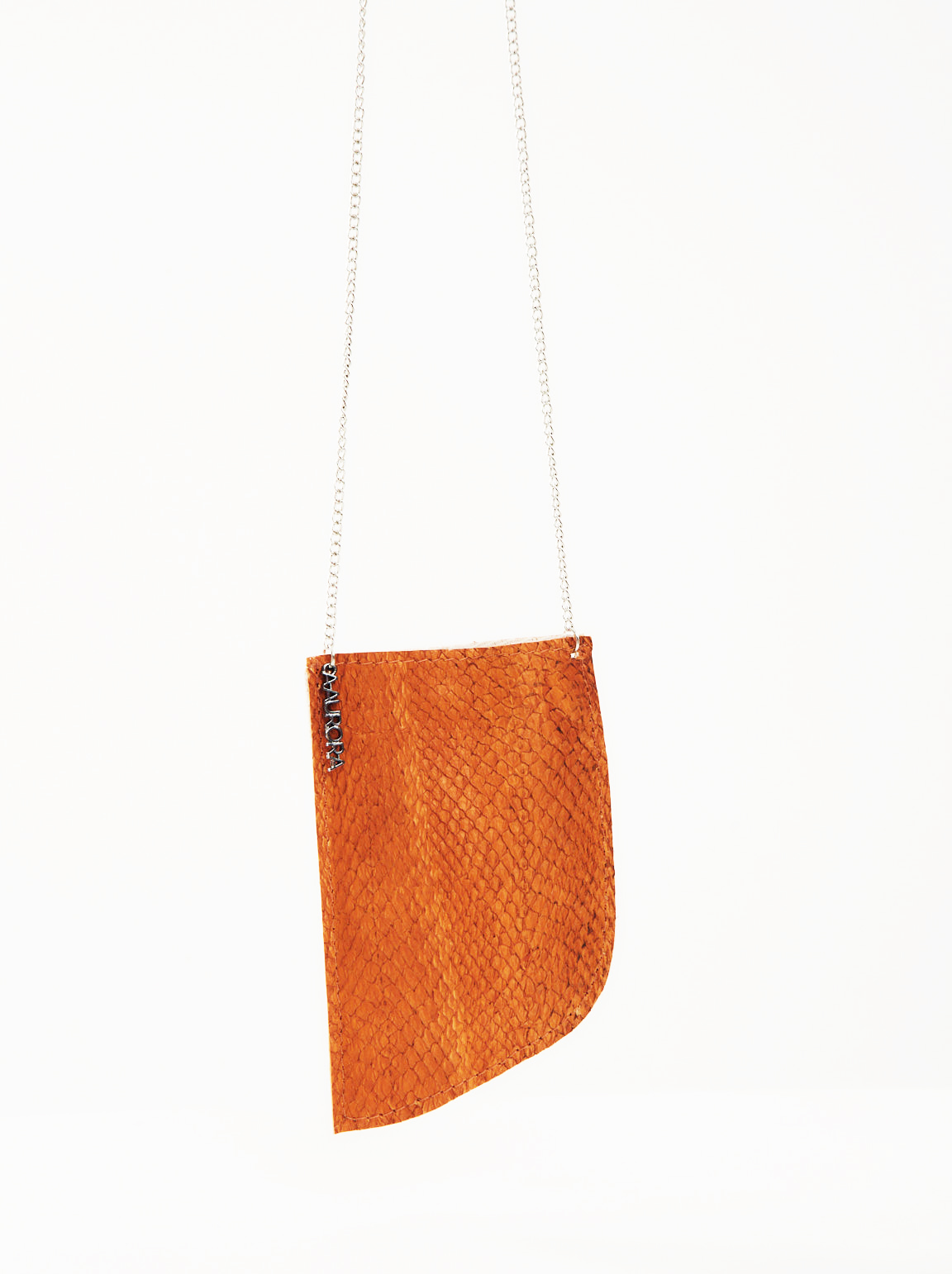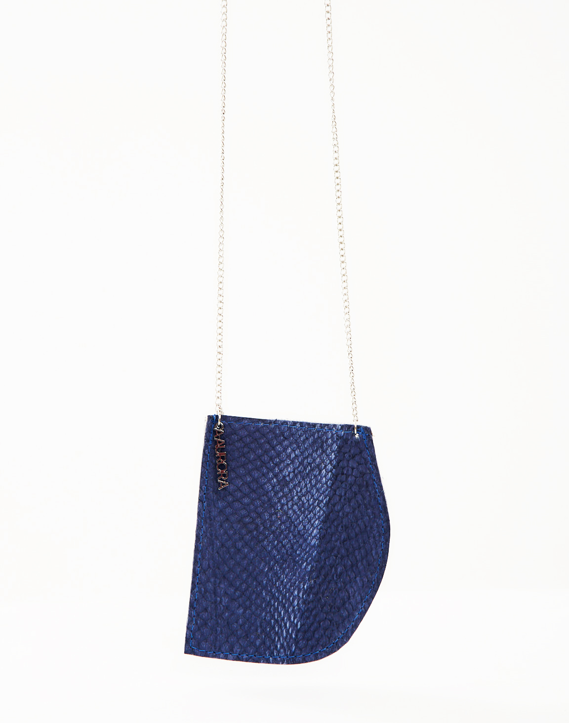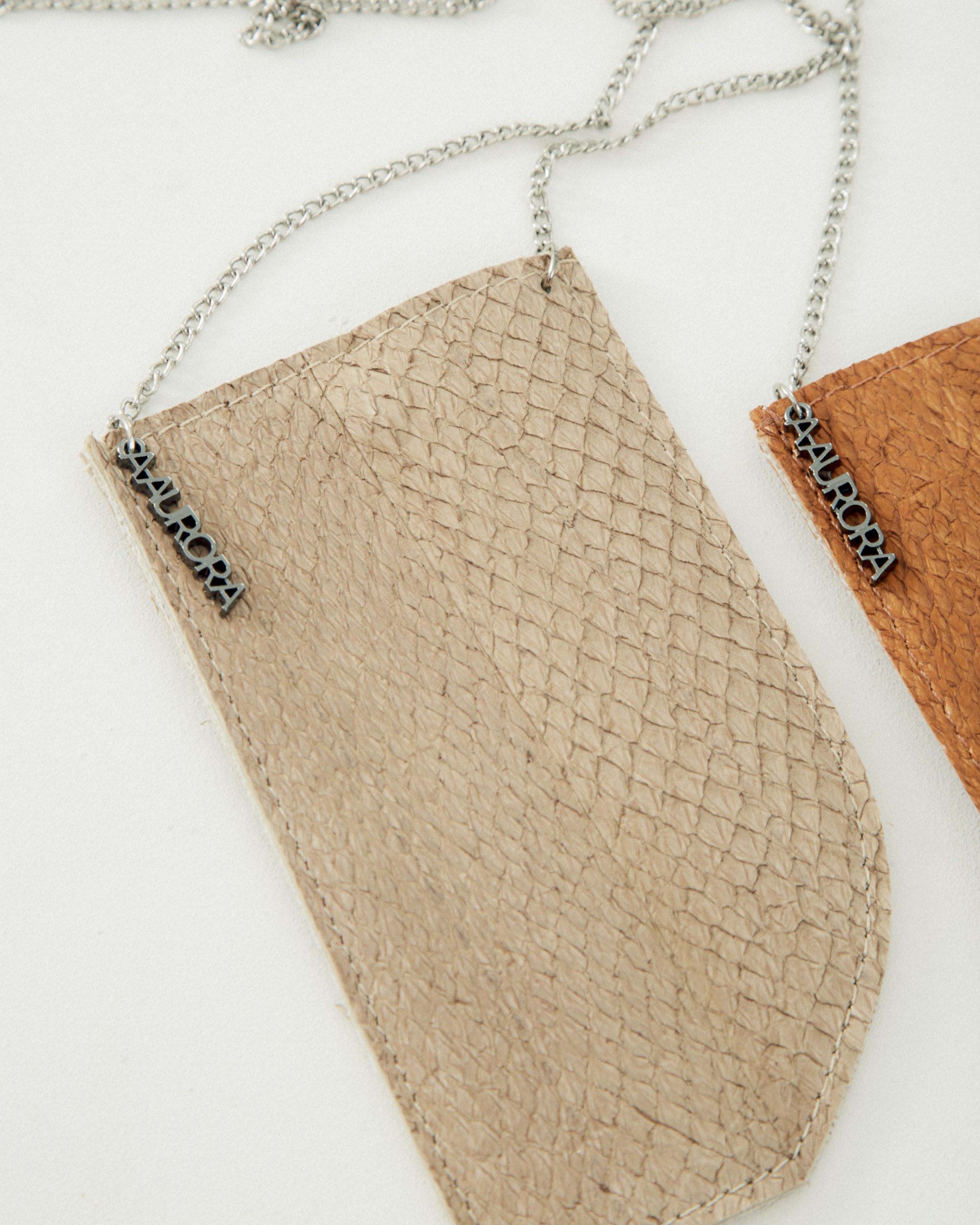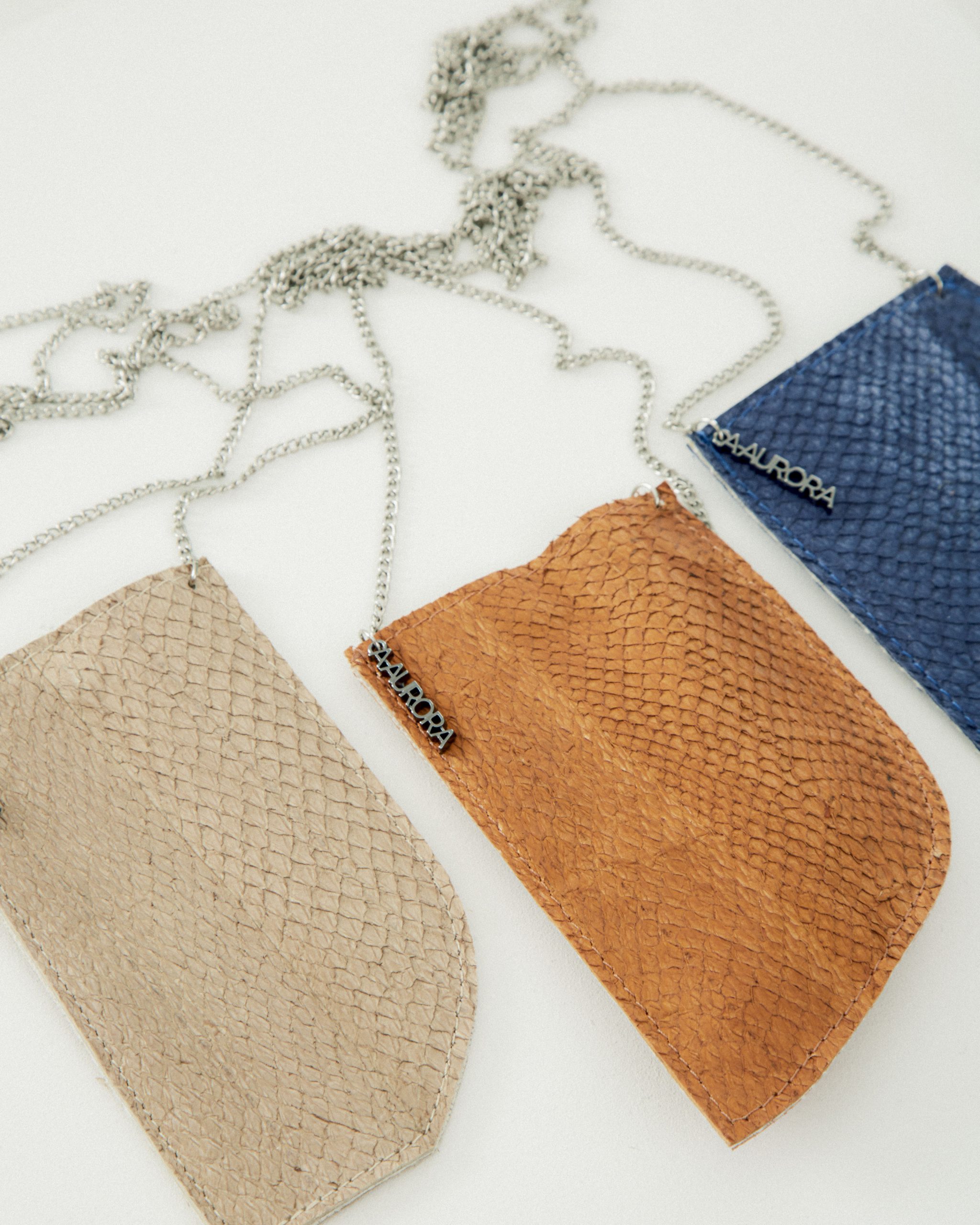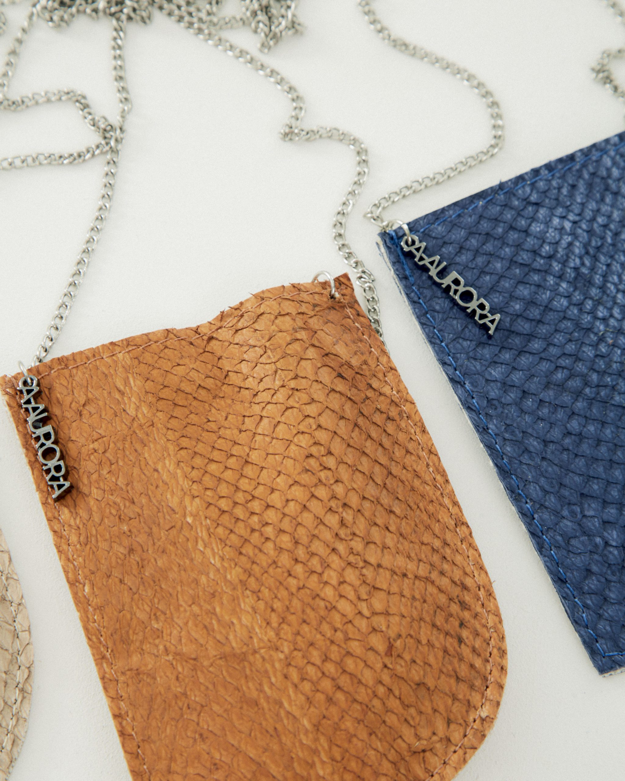 Material em pele de peixe tingido naturalmente em fábrica parceira.