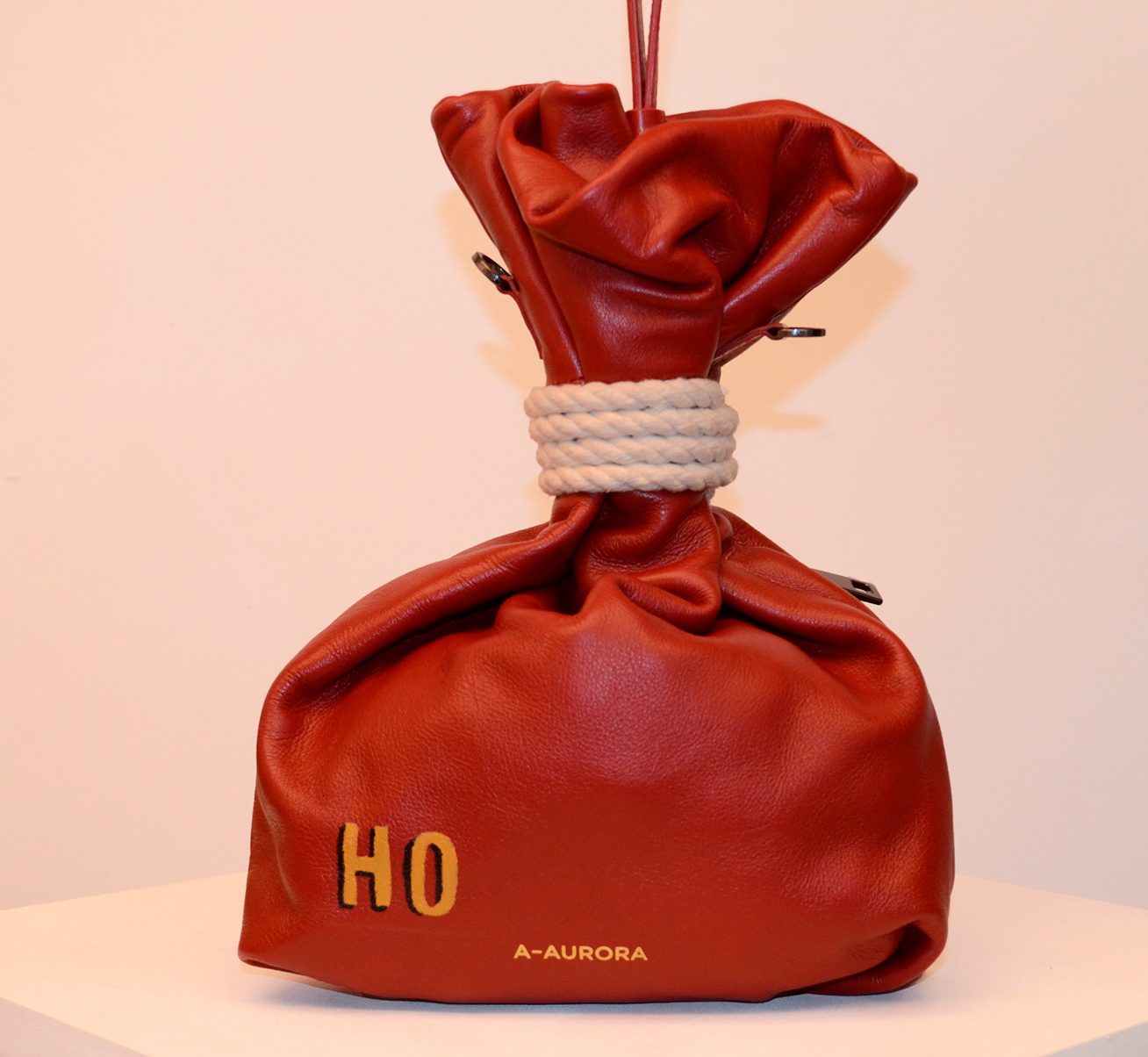 Bolsa em couro flyer preto com enfeite de corda natural cru.